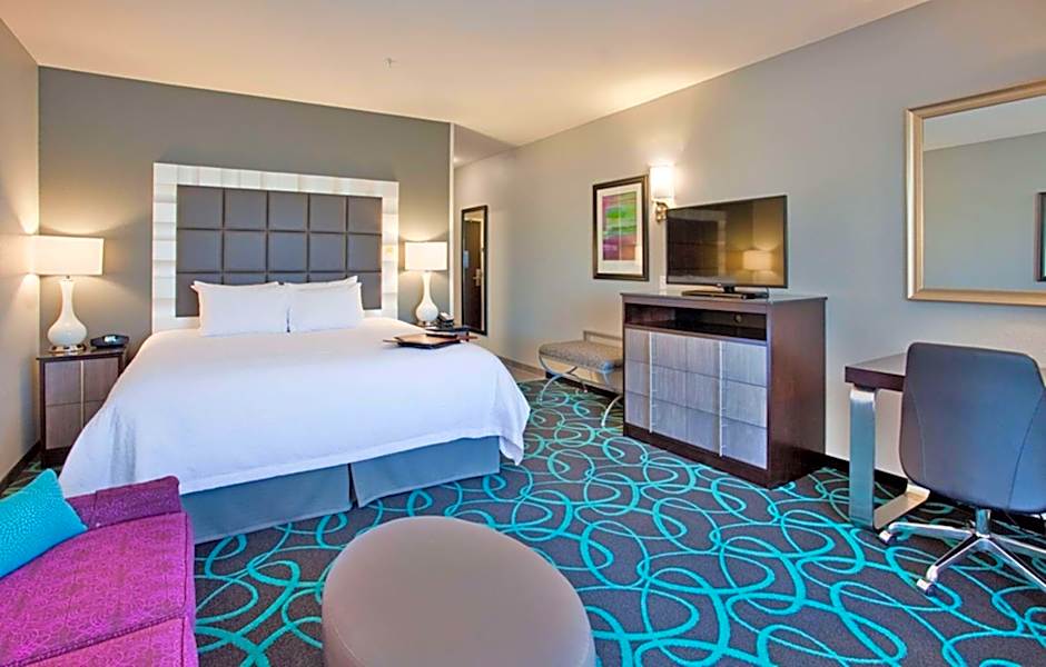A 42-inch flat-screen cable TV and sofa bed are included in this hearing-accessible room, along with a microwave and fridge.